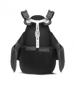 Wrap-around shoulder straps firmly attach to abdominal panel to prevent forward spinal bending